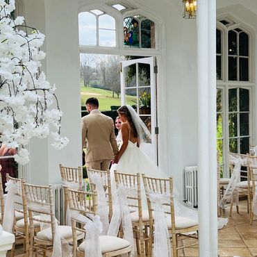 The Library houses the ornate solid-oak, hand-carved dining table ‒ perfect for displaying photos of the couple or maybe games to keep younger guests amused. The gilded Drawing Room has its own baby grand piano, as well as a famous ornate ceiling known as the ‘Burst of Angels’. Couples often choose to display their wedding cake in the bay window, with the Orangery visible across the lawn behind.