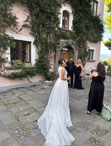 Fantastic with Fizz had the honour of performing at the most picturesque and beautiful wedding ever last weekend in Sorrento, Italy for Nessa and Joe! We flew out to Naples on the first flight of the day and were in situ ready to perform at the wonderful Capo Santo Fortunato Hotel at 4 pm! The brief was Bridgerton crossed with Dolce and Gabbana and it was the most elegant wedding we have ever seen! Everything was perfect from the view to the weather to the food to the music (even if we do say so ourselves!) After a Bridgerton set for the guest arrival, the Bridesmaids entered to Coldplays Yellow, appropriately dressed in yellow! Then it was Nessa’s turn, accompanied down the aisle by both her mother and father to a string cover of If I ain’t got you by Alicia Keys. After a moving service we all sang Can’t take my eyes off you as they took their first steps back down the aisle as man and wife! Italian weddings are very focused on the food and there were delicious canapés followed by an Italian buffet of meats and cheeses all to the strains of some romantic string covers. Finally there was a sit down 4 course meal which we were very kindly invited to! Nessa and Joe are the most wonderful couple and we wish them every happiness for their honeymoon and for their future life together back in London! Thank you so much for inviting us to be a part of your special day!