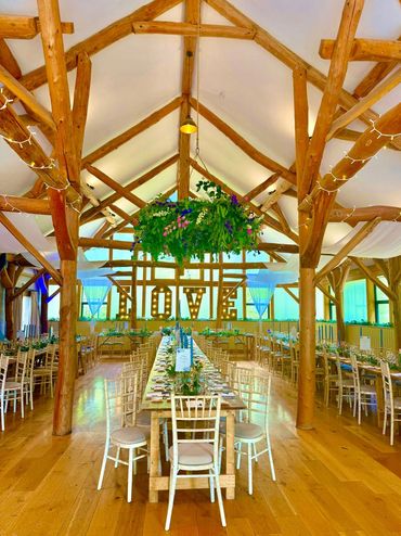 The new Pole Barn is a contemporary Cotswolds wedding venue with dining capacity for up to 120 guests. This impressive structure is geared towards sustainability with its larch frame sourced from trees in the valley, underfloor heating, powered by Air-Source Heat Pump, and huge wood-burning stove powered by Owlpen firewood if you like a roaring fire.