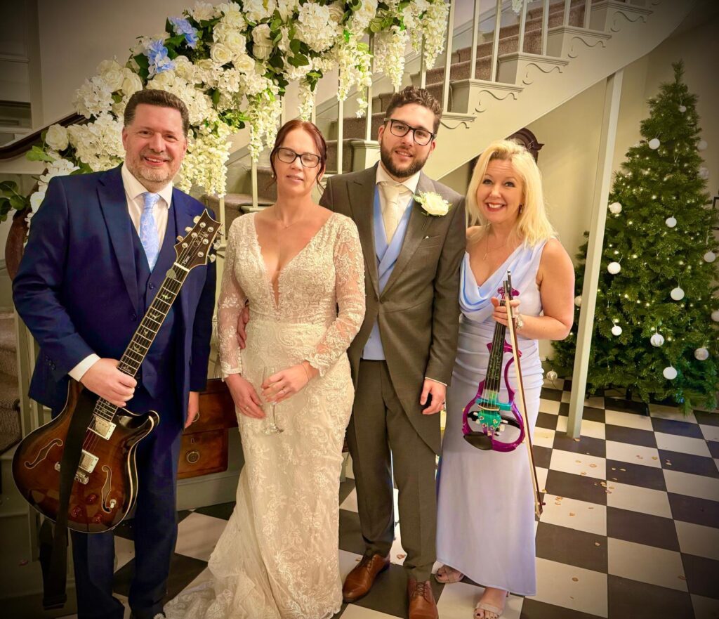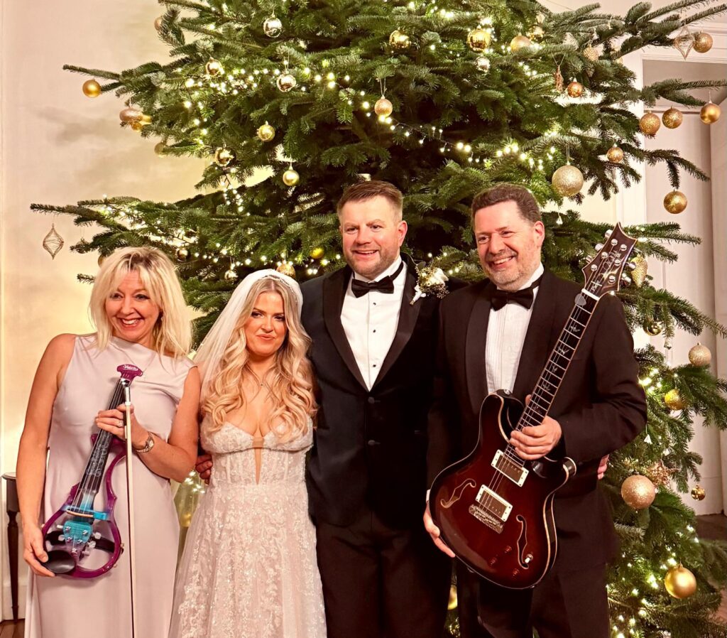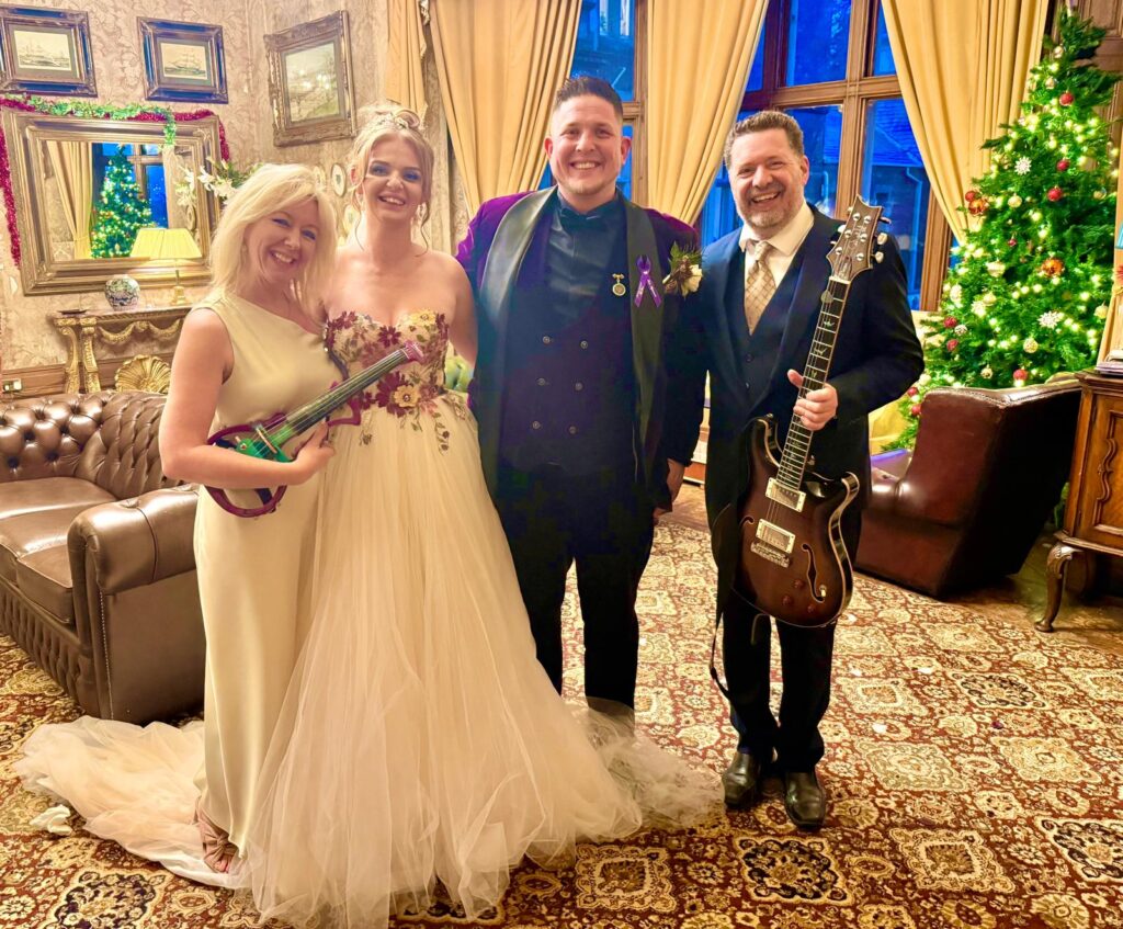 Another wonderful wedding weekend saw us venturing up to Scotland for Celine and Jack! Twinkly lights and Christmas decorations set the vibe for the day along with some really different music choices that worked brilliantly! Andy’s special guitar has so many sounds and he was excited to show them off for the Groom’s entrance to ACDC’s Hell’s Bells followed by Celine’s aisle song, Creep by Radiohead. During the register signing we rocked out to Iris and calmed things down with Unchained Melody, a classic! The exit song was Bruno Mars’ Marry You which always works brilliantly. We quickly moved rooms to set up to play an upbeat set for the Drinks Reception and had a blast, all the guests were singing along and extremely appreciative which was lovely! We then decamped to the Wedding breakfast and performed some classic Bridgerton songs. We had such a great time at this lovely wedding and wish Celine and Jack all the best for the future!