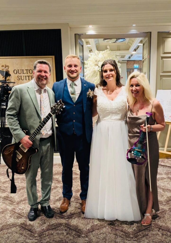 Busy wedding weekend starting with our first visit to the wonderful Oulton Hall in Leeds to play for Jess and Jack! We used our battery pack to play outside for the most beautiful ceremony in a gorgeous setting. Jess walked in to a solo violin version of Can’t Help Falling in Love with you. The stripped back sound was so hauntingly ethereal, there was not a dry eye in the house. Can You Feel The Love Tonight and Your Song were their signing songs before exiting to a bit of Dusty Springfield’s I Only Want To Be With You. We then relocated to the terrace where we played a mix of songs with everything from Tennessee Whisky to Feeling Good! We certainly felt very good at being a part of this gorgeous wedding and wish Jess and Jack every happiness in the future.