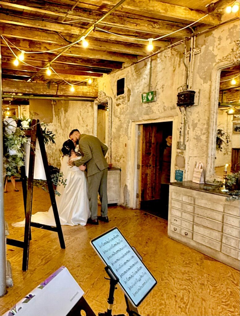 Maria and Phil are big Star Wars fans and enjoyed an eclectic mix of music including the Star Wars Theme alongside some more traditional favourites such as Starships Nothing’s Gonna Stop Us Now, A Thousand Years and All of Me by John Legend. We particularly loved the Star Wars accessories including the Millennium Falcon board and Grogu on the cake! We then relocated to the outside terrace using our battery power where we played for the drinks reception. Maria and Phil very kindly provided us with a delicious chicken pie and chips during the speeches before we took our places again for the Wedding Breakfast where we were happy to accommodate lots of requests!